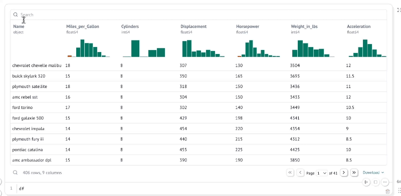 Interactive dataframes. Page through, search, filter, and sort millions of rows blazingly fast, no code required.