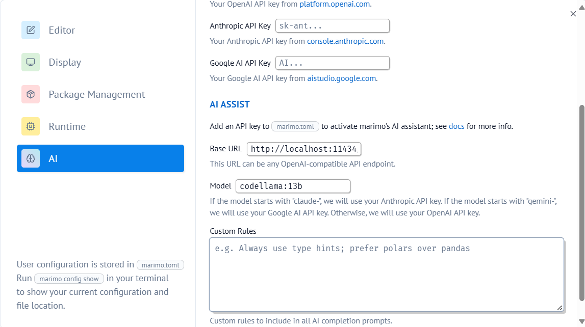 You can customize how the AI assistant behaves by adding rules in the marimo settings. These rules help ensure consistent code generation across all AI providers. You can find more information about marimo’s supported plotting libraries and data handling in the plotting guide and working with data guide.