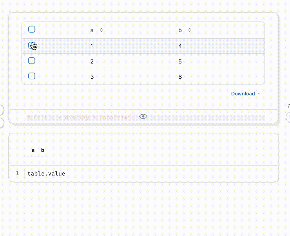 Display dataframes as interactive, selectable charts using mo.ui.altair_chart or mo.ui.plotly, or as a row-selectable table with (mo.ui.table)(marimo.ui.table). Select points in the chart, or select a table row, and your selection is automatically sent to Python as a subset of the original dataframe.